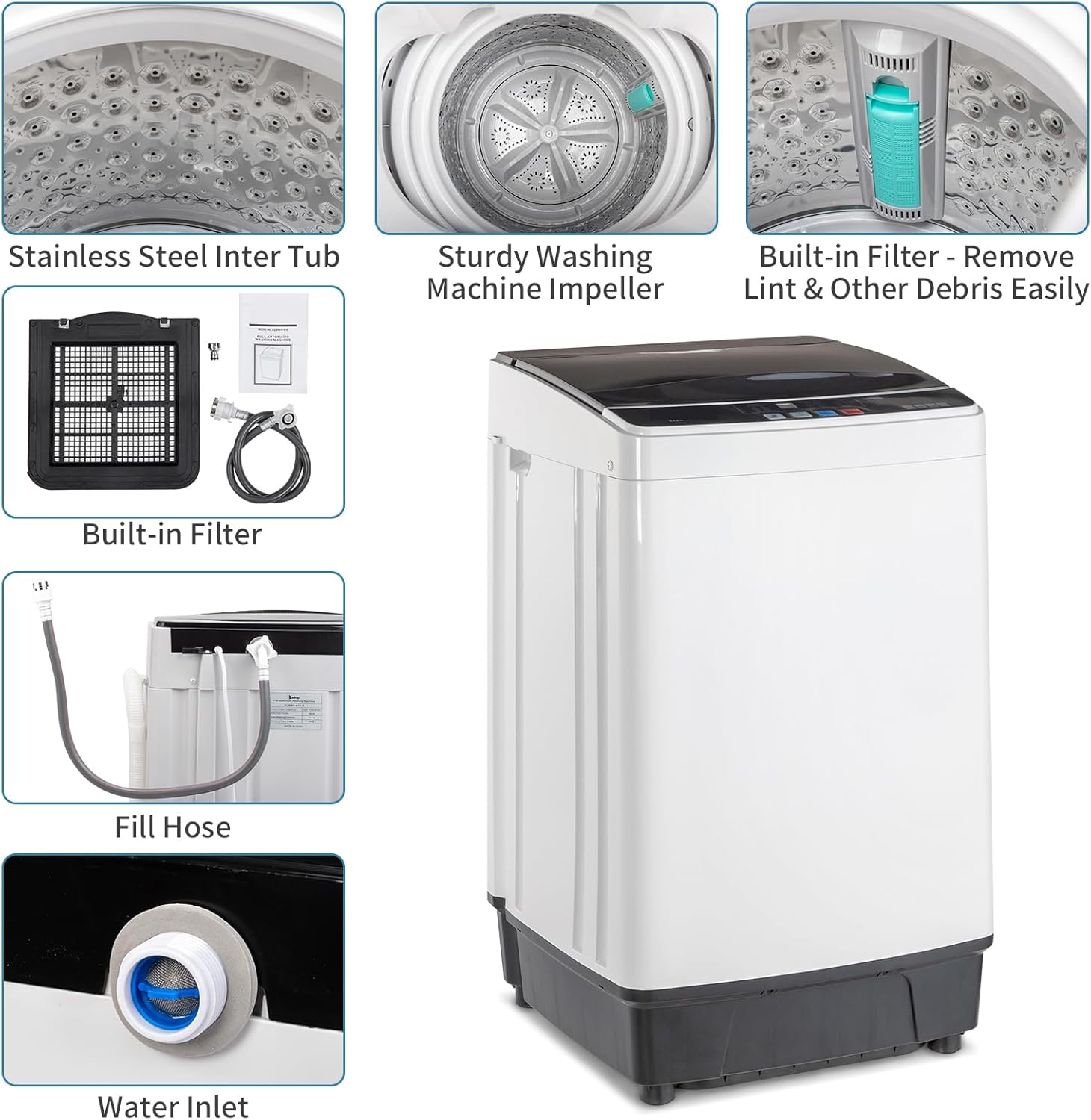 Introduction: Meet the Full-Automatic Portable Washing Machine the perfect laundry solution for small spaces without compromising on performance. Designed for apartments, RVs, dorms, and condos, this compact yet powerful washer packs a 17.6 lb capacity, 10 wash programs, and an intelligent drainage pump into a space-saving footprint. Its full-automatic operation handles everything from soaking to spin-drying, delivering up to 90% moisture removal so your clothes are ready to air-dry in no time. With stainless steel inner tub, 24-hour delay start, and energy-efficient design, this Portable Washing Machine for Apartments brings professional-grade laundry care to your home. Features: 17.6Lbs Large Capacity:Ideal for 5-6 people, handles full-size loads. Full-Automatic Operation:Soak, wash, rinse, spin, stop:one-button control. 10 Wash Programs + 8 Water Levels:Customize every load. Drain Pump Included:Pump water up to 5 feet, flexible placement. 24H Smart Delay:Preset wash cycles for convenience. Built-in Lint Filter:Easy-clean, maintain once a month. Compact & Portable:18.1" x 18.5" x 31.9", fits tight spaces. Universal Faucet Adapter:Compatible with most faucets. Specifications: Type: Top-Loading Full-Automatic Portable Washer Rated Capacity: 17.6 lbs (8 kg) Rated Power: 200W Voltage / Frequency: 110V / 60Hz (US Plug) Water Levels: 8 adjustable levels (1L–8L) Wash Programs: 10 preset cycles Inner Tub Material: Stainless Steel Cabinet Material: PP Plastic Motor Material: Aluminum Drain Pump: Yes, with up to 5ft lift height Delay Start: 2–24 hours programmable Inlet Hose Length: 39.37 inches (100 cm) Product Dimensions: 18.11" L x 18.5" W x 31.88" H (46 x 47 x 81 cm) Net Weight: 37.96 lbs (17.22 kg) Package Includes: 1 x Washing Machine, 1 x User Manual, 1 x Protective Barrier Board, 1 x Snap Coupling Adapter