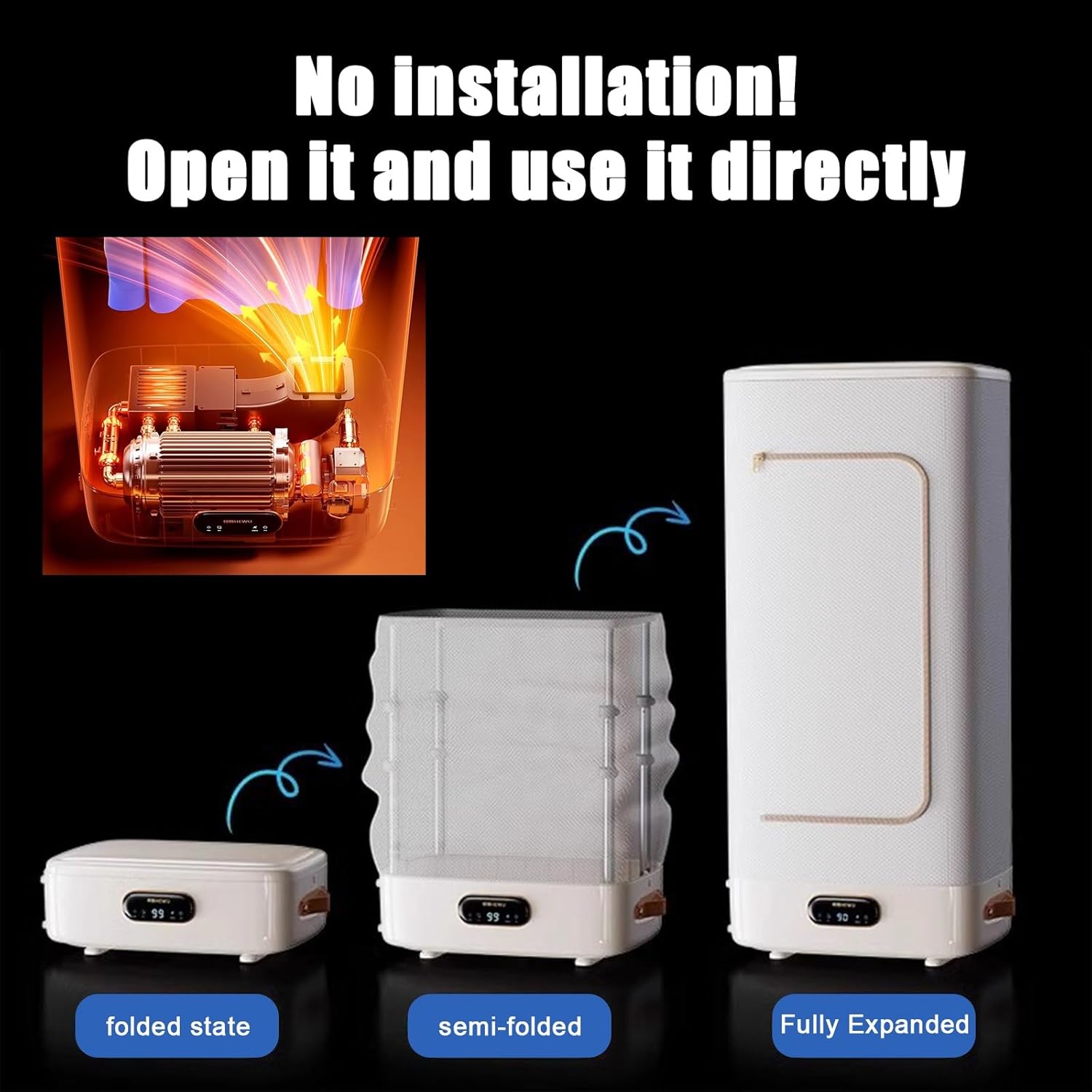 Features -High efficiency and energy saving, with intelligent temperature control system, the inner cover reaches a predetermined temperature, the power is automatically reduced, thus reducing power consumption. -Convenient storage, foldable storage design, does not take up space. -Two simple steps to use, open the cover to install the telescopic rod, plug in the electricity can be used. Product Specification Name: Portable Foldable Dryer Material: waterproof oxford cloth clothes cover Size: 54*36.5*135cm/21.3*14.4*53.1 inches (unfolded) 54*36.5*20.5cm/21.3*14.4*8.1 inch (folded)