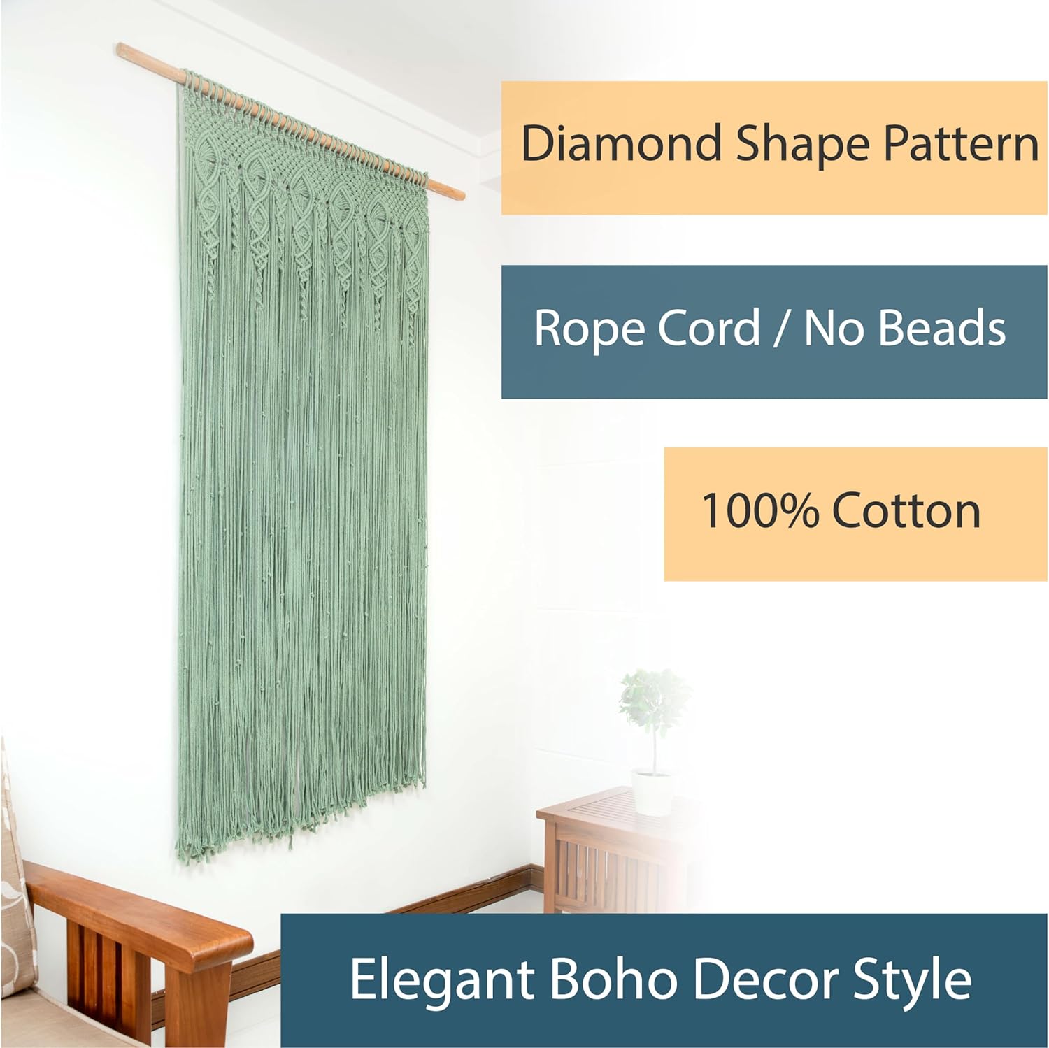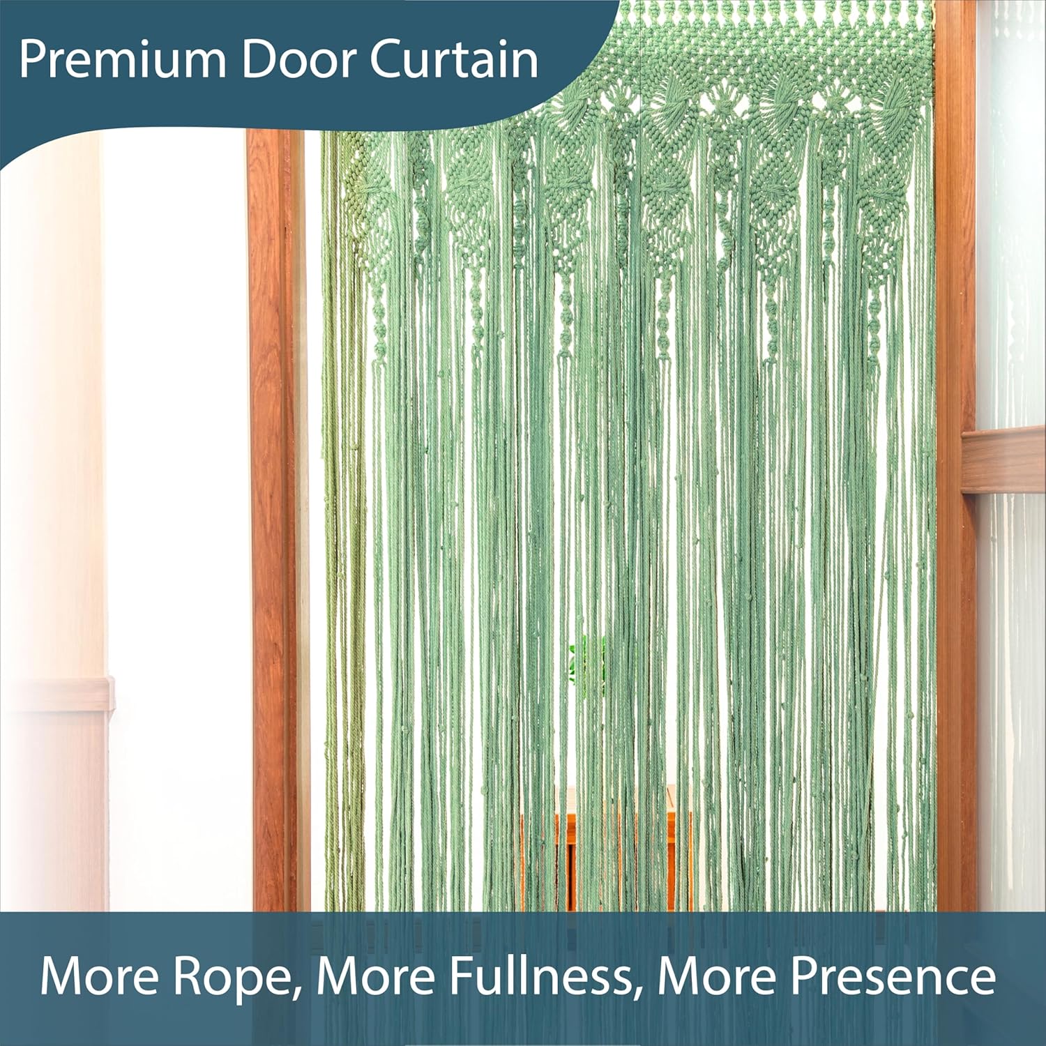 Transform your doorways with our Premium Light Sage Green Macrame Door Curtain - a handcrafted 40" x 80" rope curtain that brings bohemian elegance and functional privacy to your home. PREMIUM ROPE, NOT PLASTIC BEADS Unlike typical beaded curtains, our macrame features genuine 4mm thick cotton rope (not standard 3mm) that's substantially heavier and more luxurious. No plastic beads means no clicking sounds, no breakage, and a more sophisticated aesthetic that elevates your space with silent, flowing movement. EXTRA DENSE, EXTRA BEAUTIFUL We craft each curtain with additional rope strands beyond standard macrame patterns — not for a thicker wall, but for a richer, more luxurious drape. The extra density means your doorway becomes a genuine design feature: full, flowing, and architectural. Where standard macrame looks sparse, ours looks considered. The diamond-pattern weaving catches light differently throughout the day, creating a subtle texture that flat curtains simply can't match. EXCLUSIVE SAGE GREEN COLOR Our signature light sage green is a calming, on-trend shade that complements multiple décor styles - modern farmhouse, coastal, boho, contemporary, and minimalist interiors all benefit from this sophisticated neutral-green tone. This exclusive color isn't available from other macrame sellers. GENUINE 4MM THICKNESS GUARANTEE Many sellers advertise "thick rope" but deliver thin 3mm cord. We guarantee authentic 4mm cotton rope throughout the entire piece - you'll immediately feel the substantial weight and quality difference. What you see in photos is exactly what you receive. HANDCRAFTED WITH CARE Each macrame curtain is hand-knotted with meticulous attention to detail, making every piece slightly unique. The intricate diamond pattern creates beautiful visual texture while the premium cotton maintains its elegant drape and appearance for years. DESIGNED FOR DOORWAYS, LOVED IN BOHO SPACES At 40" x 80" this curtain is sized and weighted specifically for standard door frames — it hangs with intention, not as an afterthought. Whether you're softening a bedroom entrance, adding warmth to a hallway, or creating a focal point in your living space, the sage green and diamond pattern do the work. PERFECT FOR: Bedroom privacy, bathroom doorways, closet openings, pantry entrances, nursery room division, bohemian-themed spaces, or anywhere you want elegant separation without traditional solid doors. THOUGHTFUL GIFT An exceptional housewarming, wedding, or birthday gift for anyone who appreciates handcrafted bohemian style, functional home décor, or coastal/farmhouse aesthetics. SPECIFICATIONS: - Size: 40" wide x 80" long (standard doorway dimensions) - Weight: 6.7lbs (use a rod rated 10lbs+ for best results) - Material: Premium 4mm cotton rope (not beads, not 3mm) - Color: Light sage green (exclusive hand-dyed shade) - Style: Diamond pattern macrame with extra density - Care: Spot clean or gentle hand wash; air dry Bring artistic elegance and functional privacy to your home with this genuinely premium, extra-thick macrame rope door curtain in beautiful sage green.