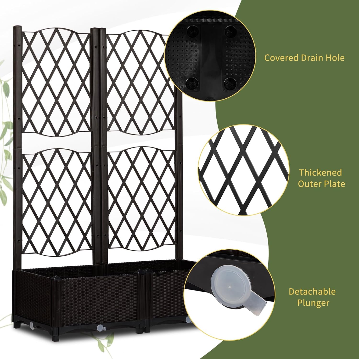 Specifications: 1. Material: Plastic 2. Overall Dimensions: (31.5 x 15.7 x 48.2) in / (80 x 40 x 122.5) cm 3. Interior Planter Box Dimensions: (29.9 x 14.2 x 7.1) in / (76 x 36 x 18) cm 4. Base Dimensions: (15.2 x 14.6) in / (38.5 x 37) cm 5. Support Leg Height: (1) in / (2.5) cm 6. Trellis Dimensions: (31.1 x 1.2 x 39) in / (79 x 3 x 99) cm Package Includes: 1 x Wicker Trellis Planter